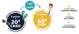 For each night you spend in one of our 300 hotels, get one point. Valid during 3 years, those points are converted into cash, the amount depends of your yearly attendance.